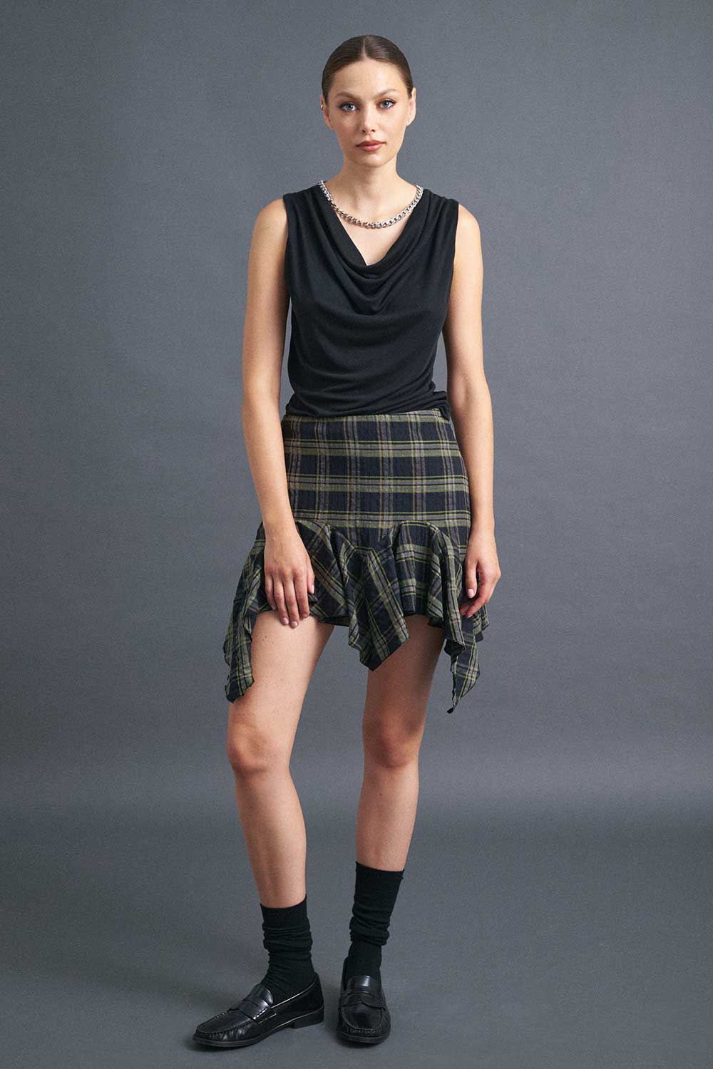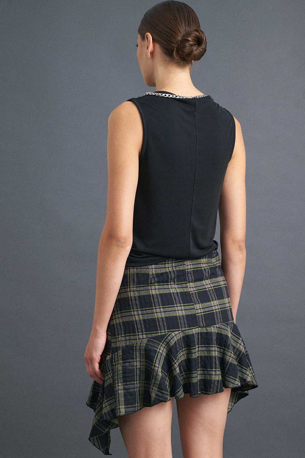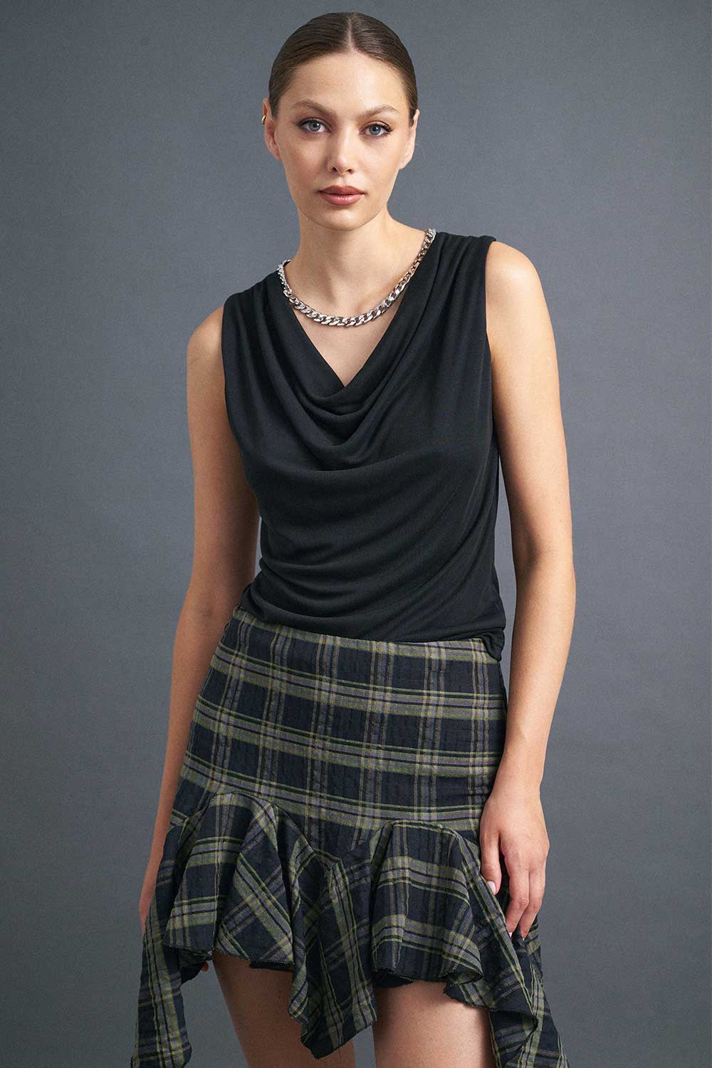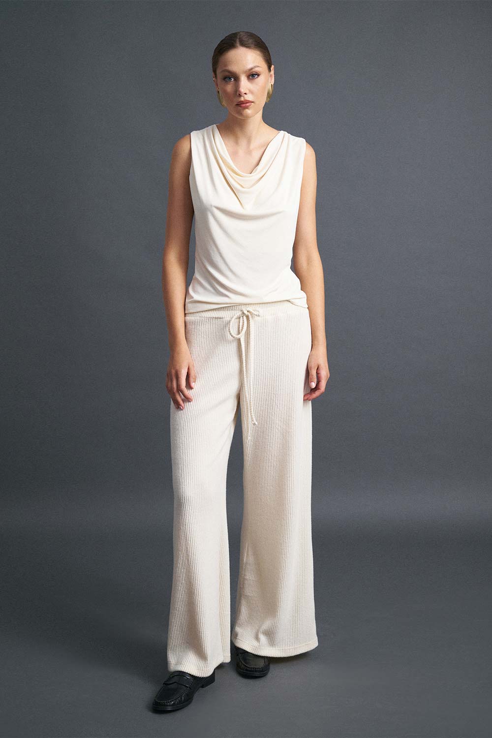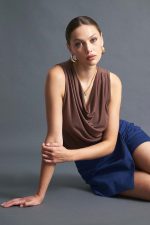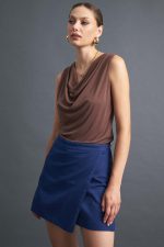 Αμάνικη μπλούζα ντραπέ, διαθέσιμη σε εκρού, μαύρο και καφέ χρώμα.