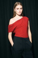 Μπλούζα one size, με λοξό ώμο, γυαλάδα και ντραπέ πλάτη. Διαθέσιμη σε μαύρη και κόκκινη απόχρωση.