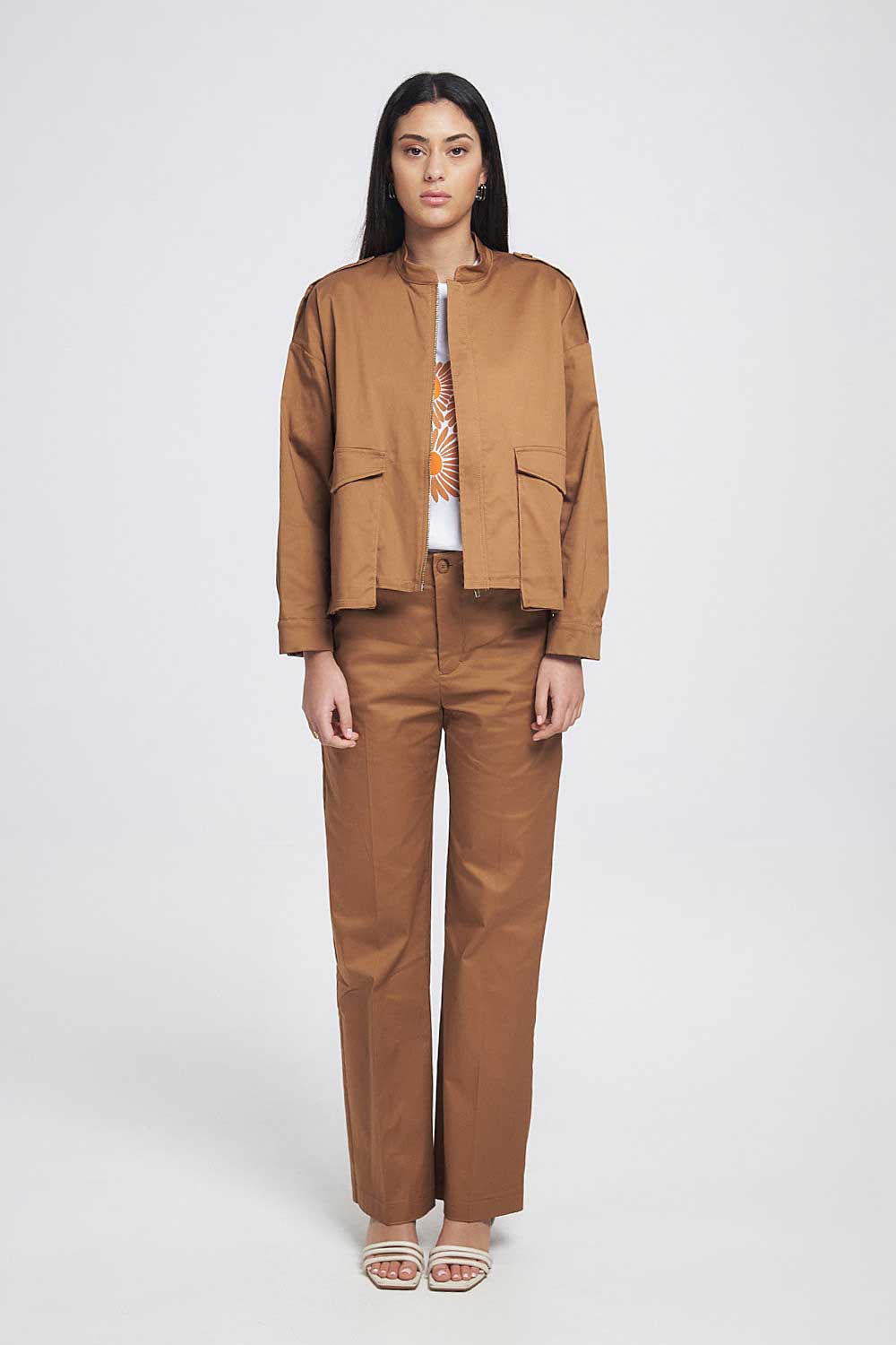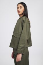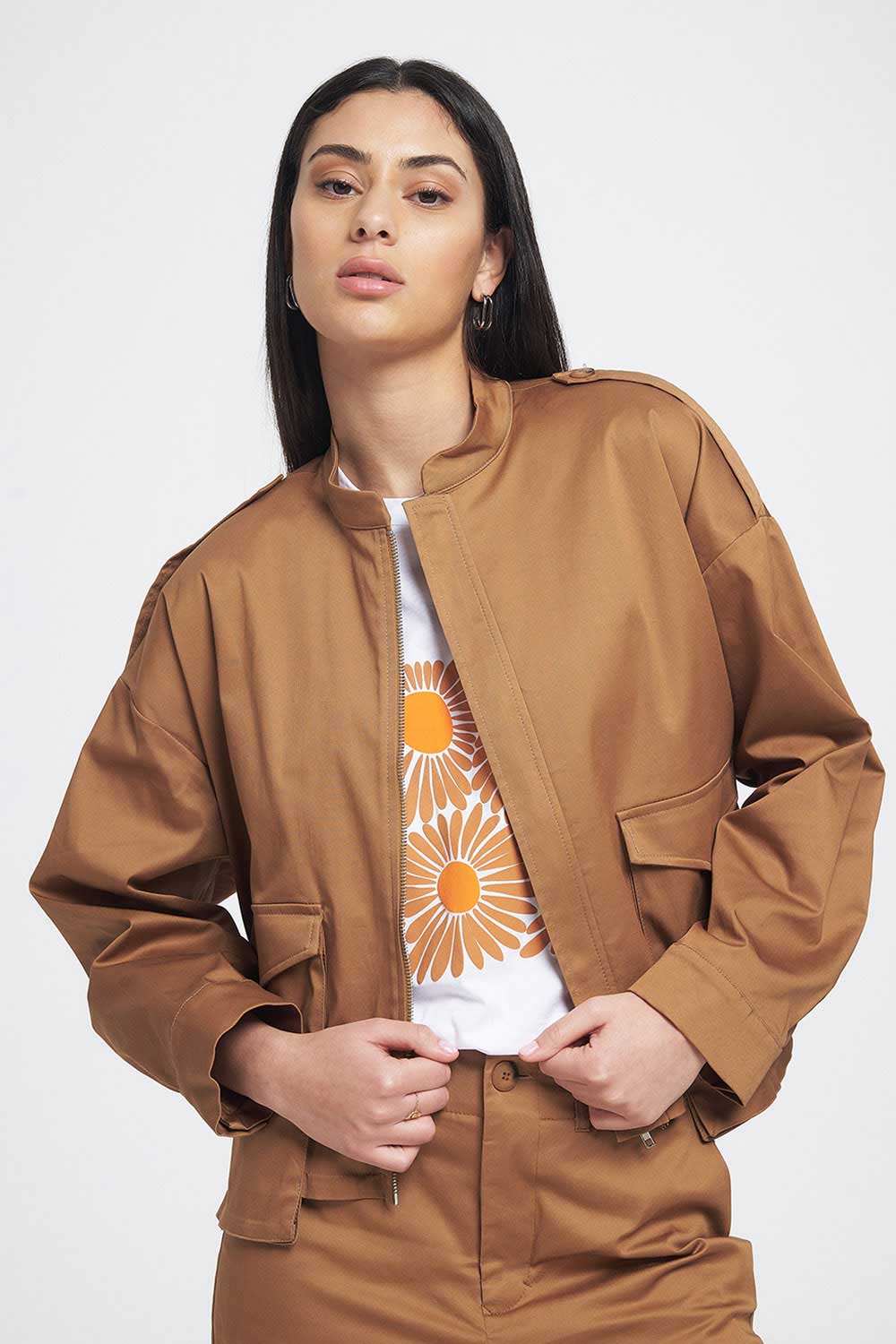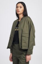 Τζάκετ one size καπαρντίνα σε χακί και καφέ απόχρωση απόχρωση με τσέπες. Κλείσιμο με φερμουάρ και γιακά μάο.