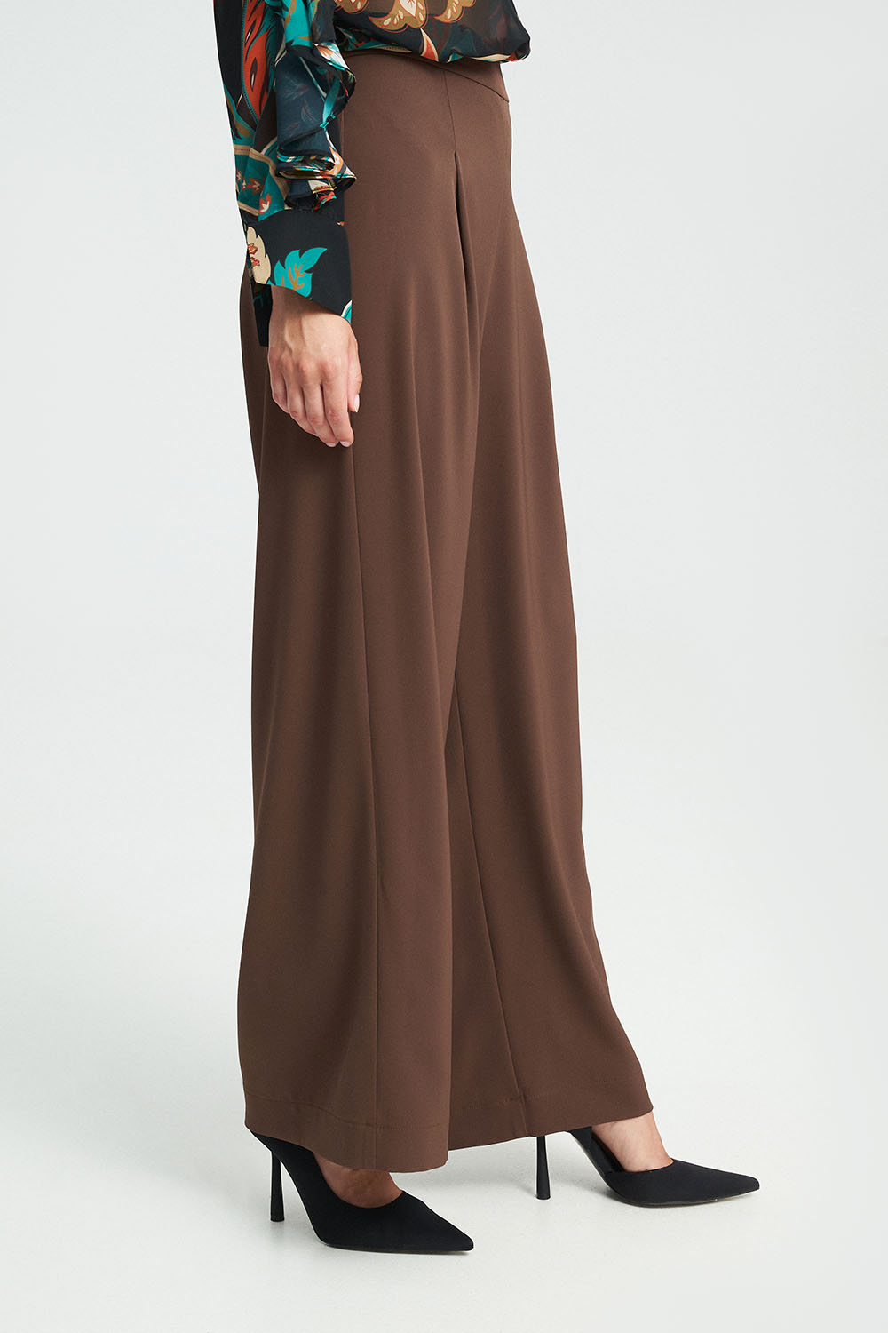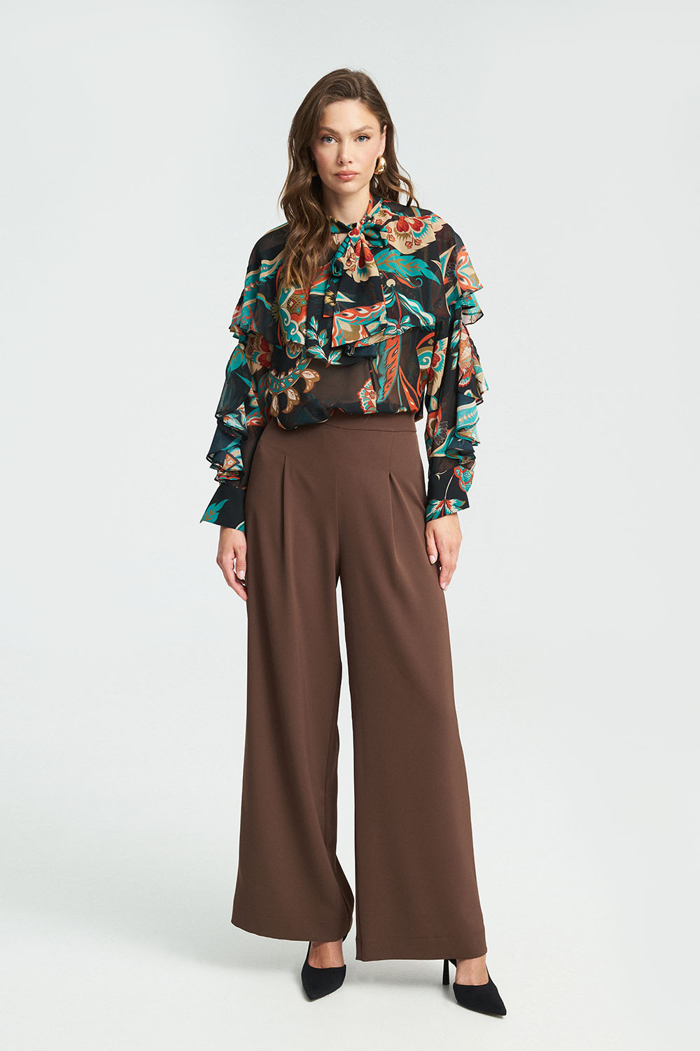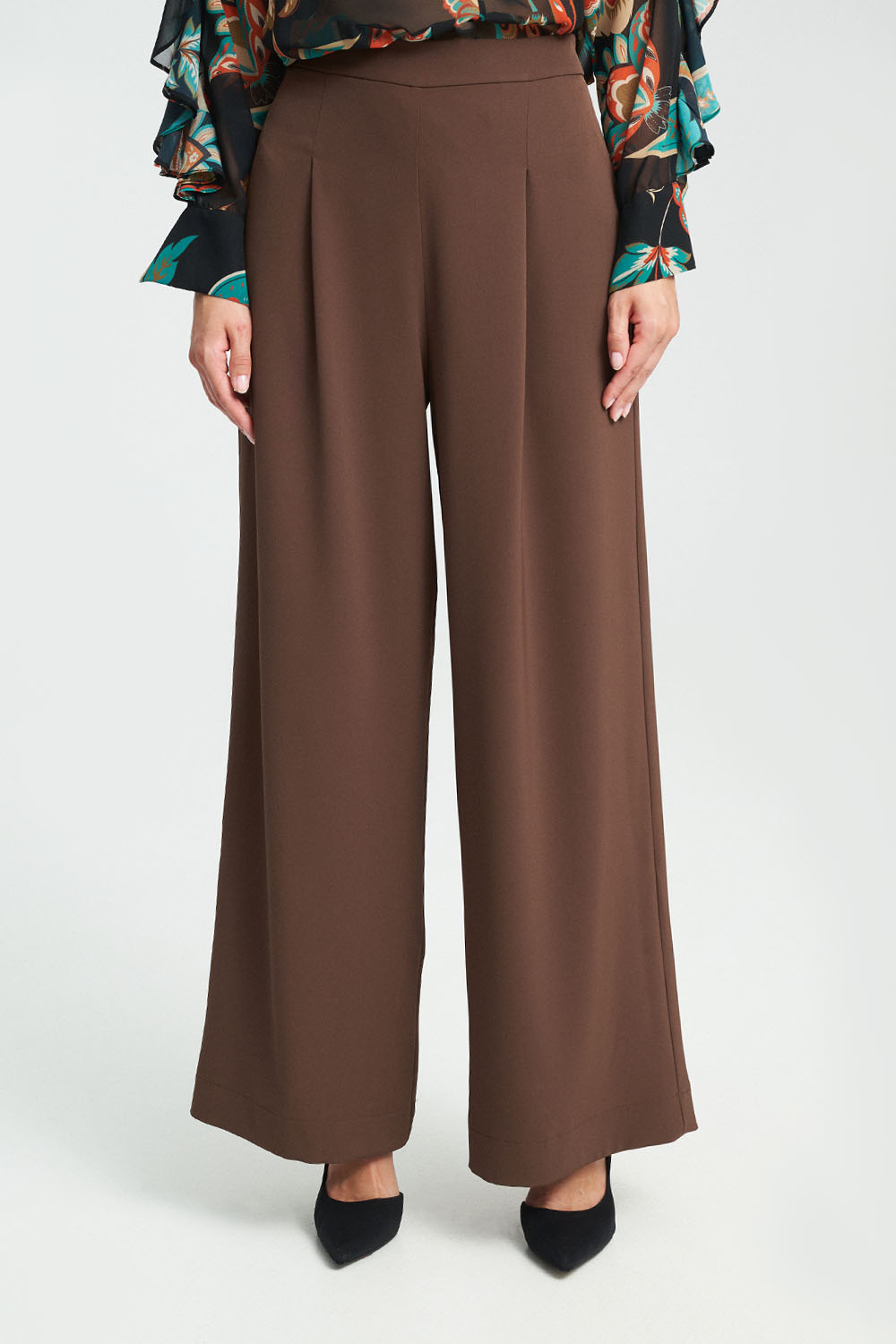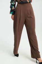 Παντελόνι με πιέτες και φαρδιά μπατζάκια. Διαθέσιμο σε καφέ και μαύρο χρώμα.