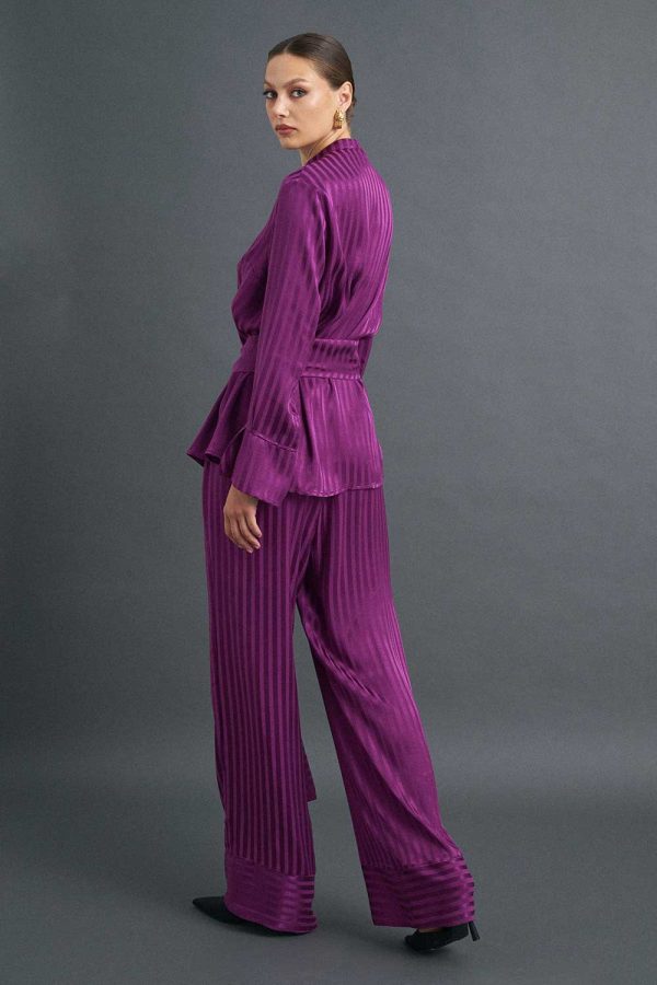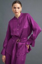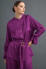 Πουκάμισο με διακριτές ρίγες και μάο γιακά, σε magenta απόχρωση.