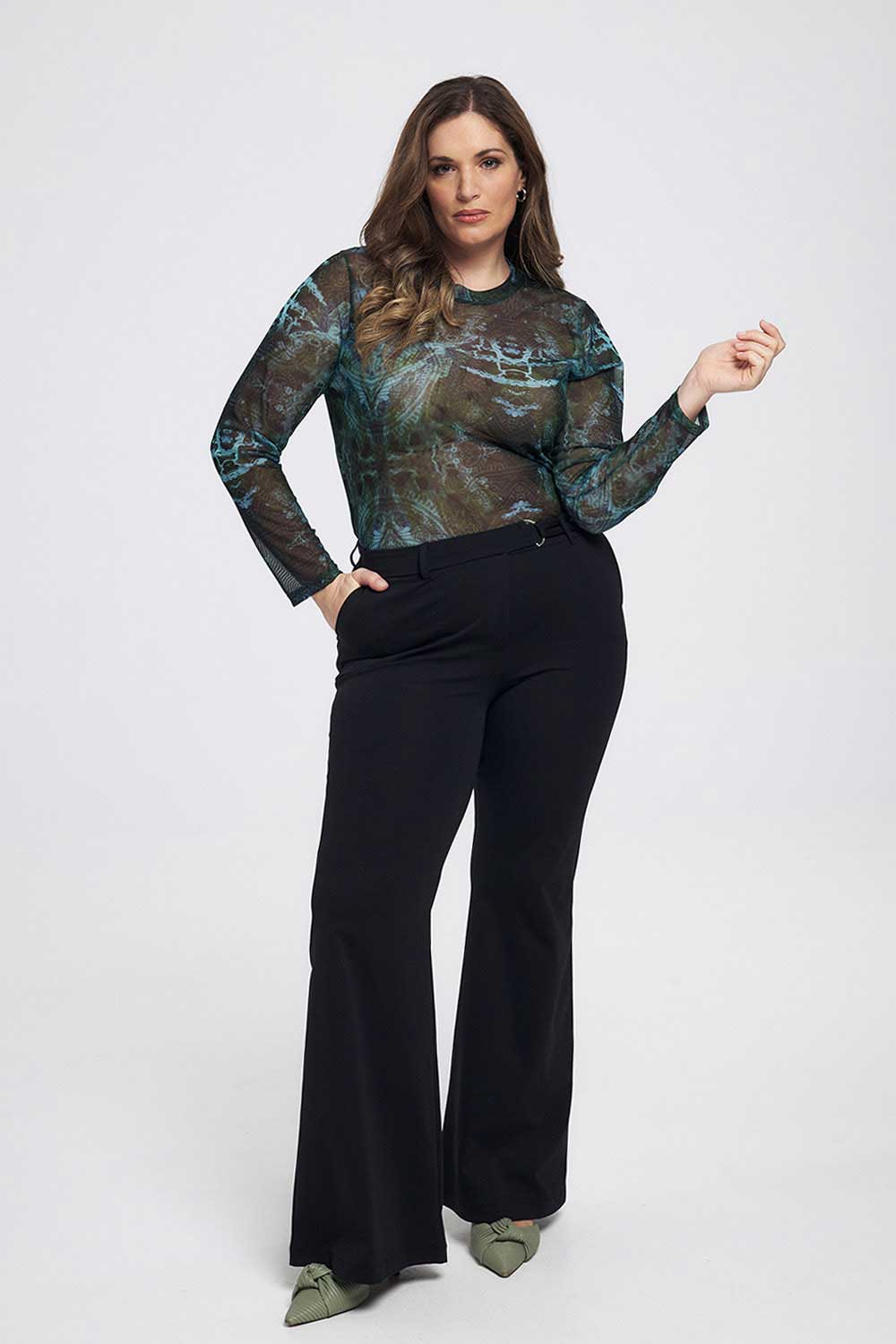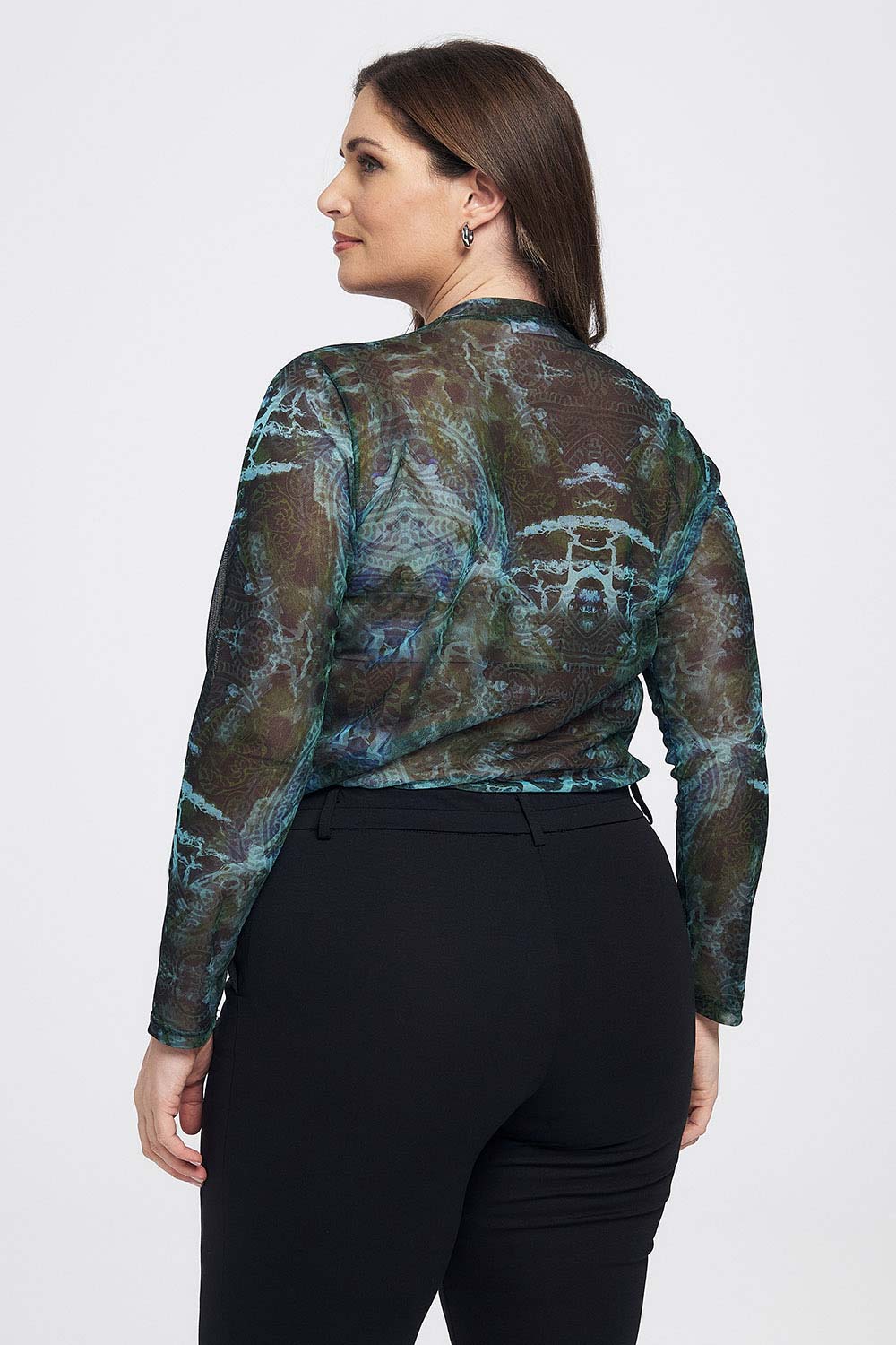 Εφαρμοστή μπλούζα plus size με διαφάνεια, με εμπριμέ σχέδιο σε αποχρώσεις του μπλε και σκούρο πράσινο.