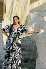 Φόρεμα plus size εμπριμέ σε ασπρόμαυρη απόχρωση.