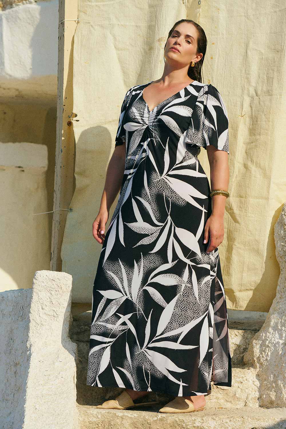Φόρεμα plus size εμπριμέ σε ασπρόμαυρη απόχρωση.