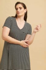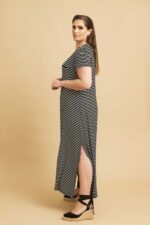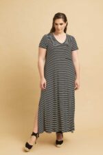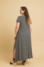 Ριγέ φόρεμα plus size με τσεπάκι και διακριτικό σκίσιμο στο πλάι. Διαθέσιμο με ασπρόμαυρο ριγέ και μπλε σκούρο.