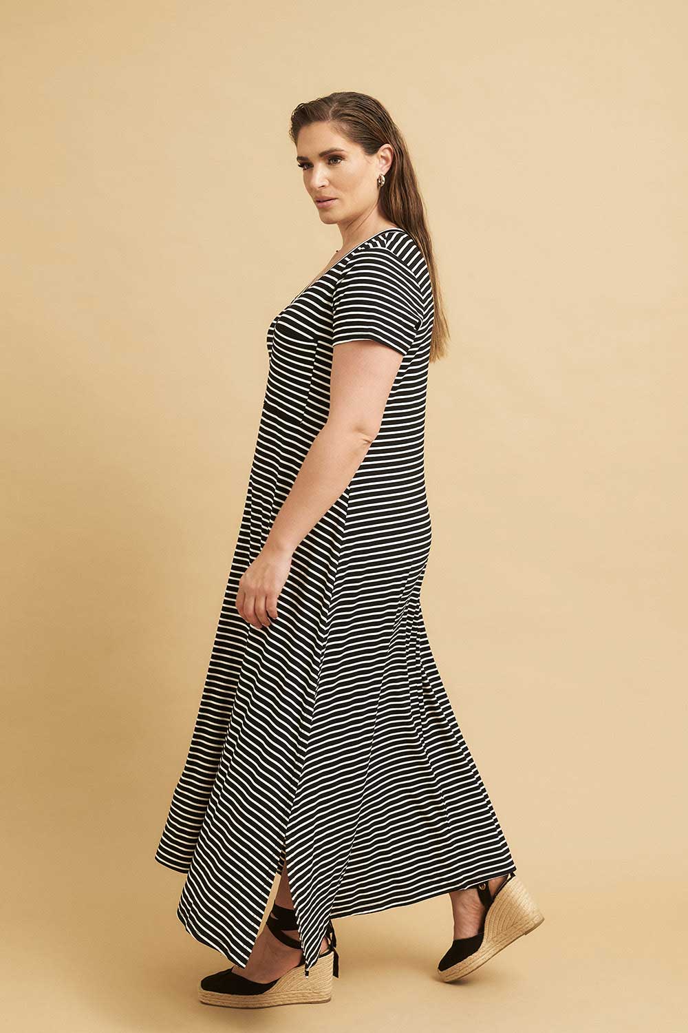 Ριγέ φόρεμα plus size με τσεπάκι και διακριτικό σκίσιμο στο πλάι. Διαθέσιμο με ασπρόμαυρο ριγέ και μπλε σκούρο.