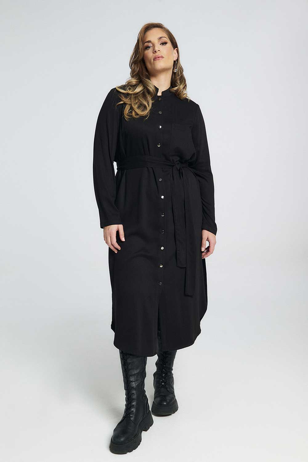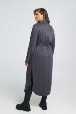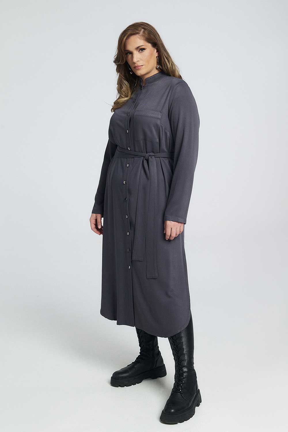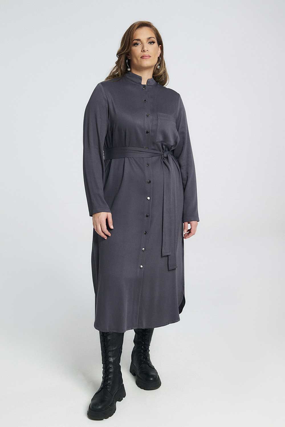 Φόρεμα plus size σεμιζιέ, με ζωνάκι από το ίδιο ύφασμα. Διαθέσιμο σε μαύρο και σκούρο γκρι χρώμα.