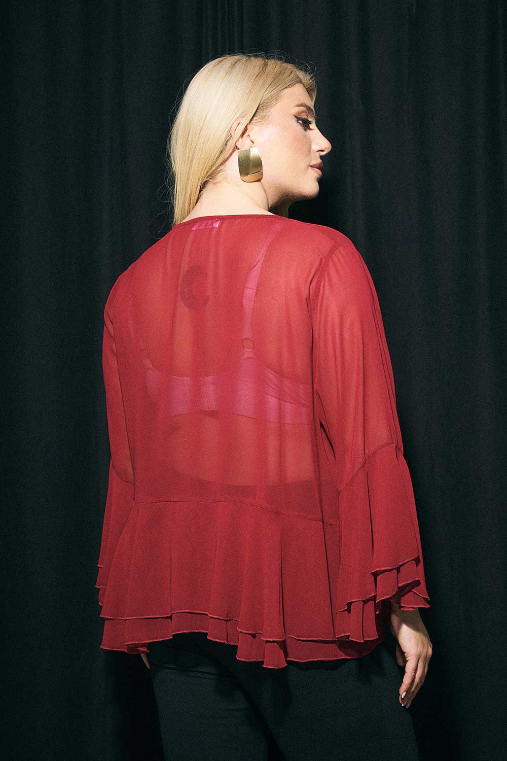 Μπλούζα plus size με βολάν, διαθέσιμη σε μαύρη και κόκκινη απόχρωση.