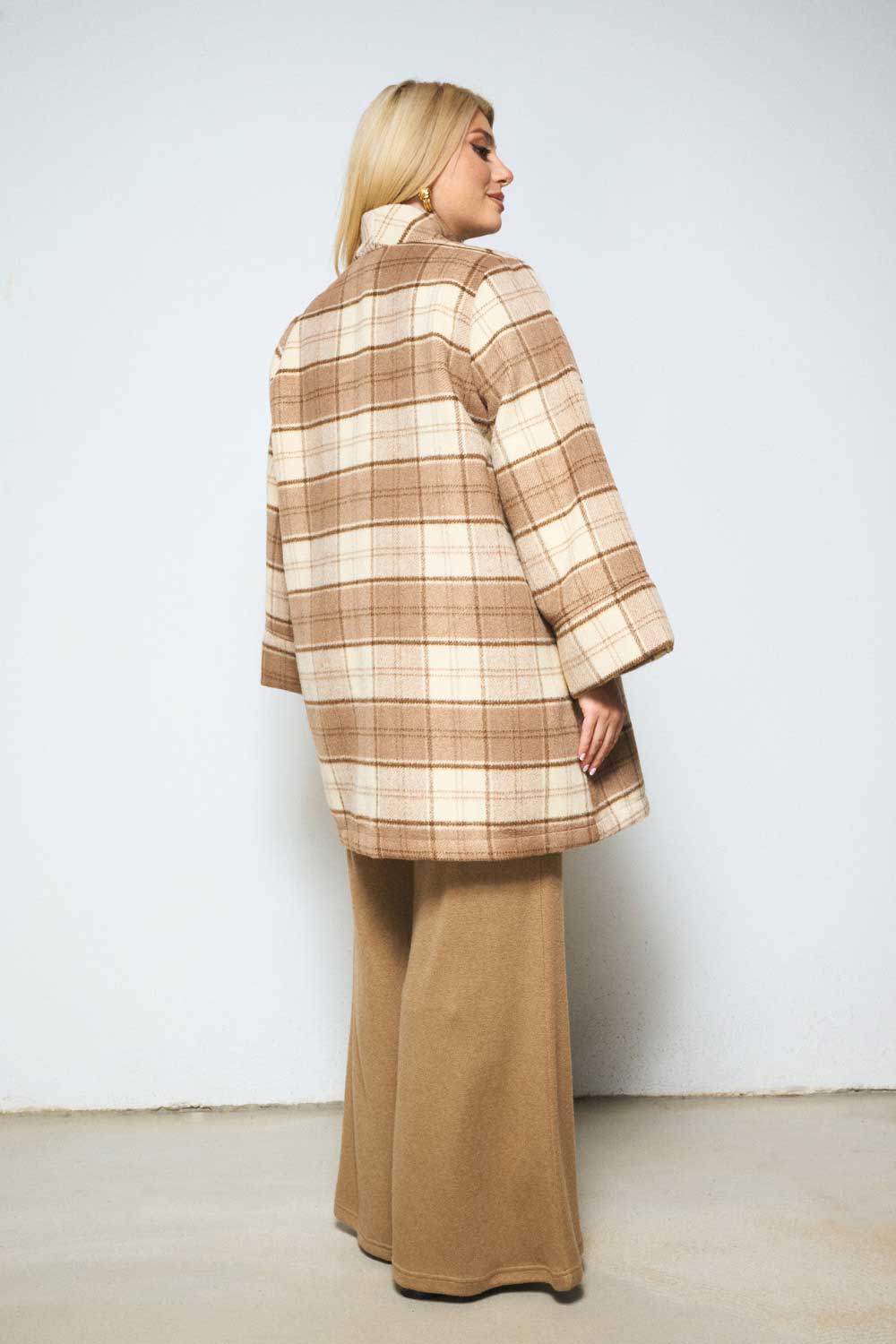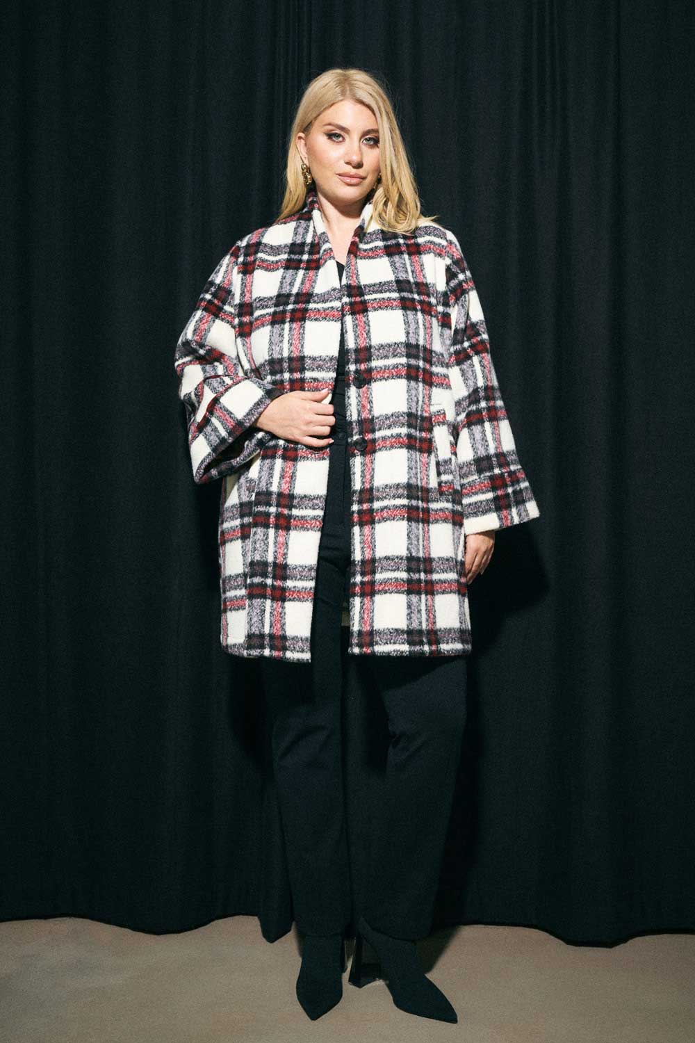Ημίπαλτο plus size με καρό σχέδιο, διαθέσιμο στις παρακάτω αποχρώσεις: Μπεζ καρό, ασπρόμαυρο καρό και ασπρόμαυρο με κόκκινο καρό.