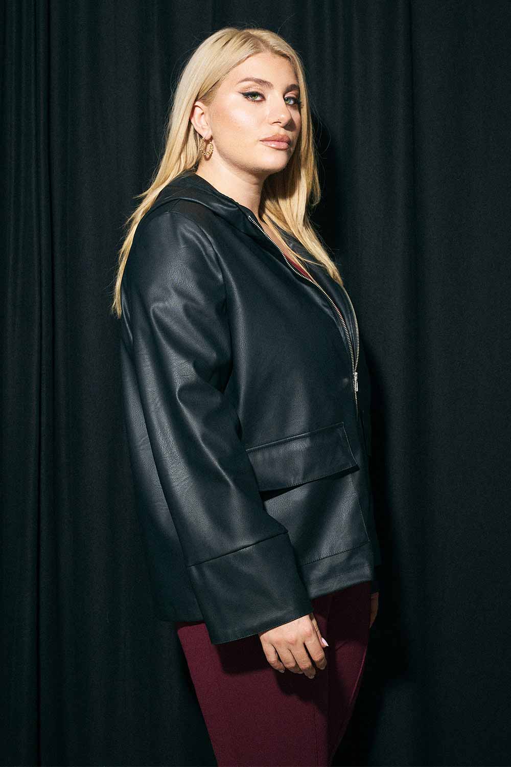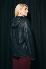 Jacket plus size δερματίνη με κουκούλα και κλείσιμο με φερμουάρ. Διαθέσιμο σε μαύρη απόχρωση.