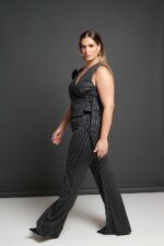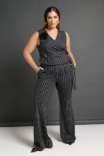 Παντελόνι plus size με ρίγες σε γραμμή καμπάνα σε γκρι σκούρο χρώμα.