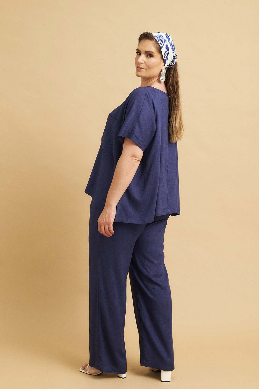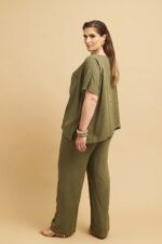 Λινή παντελόνα plus size, διαθέσιμη σε σκούρο μπλε, σάπιο μήλο και χακί χρώμα.